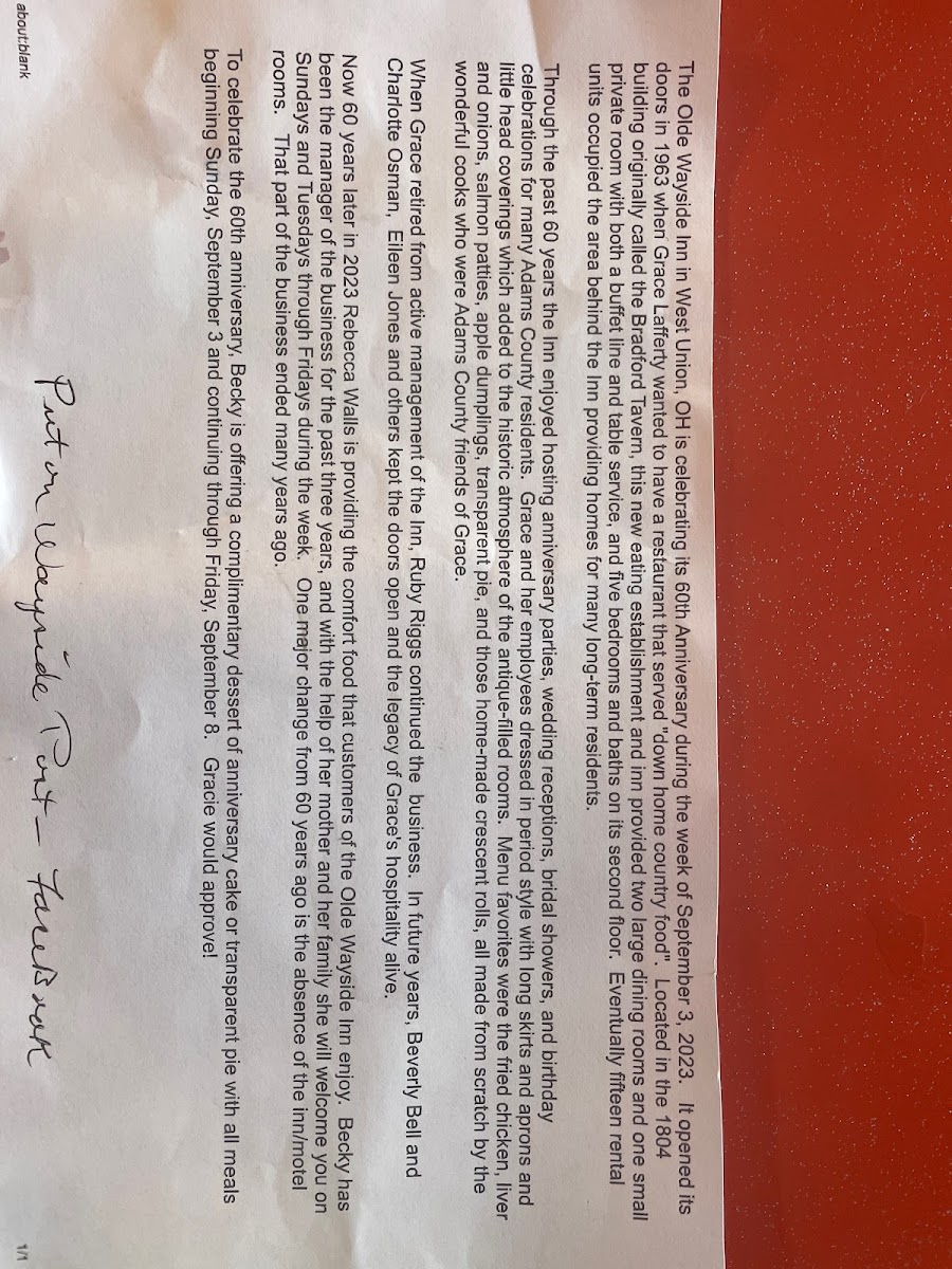 Welcome to The Olde Wayside Inn in West Union, Ohio, a charming eatery nestled in a beautifully restored colonial building. Known for its inviting atmosphere and friendly service, this restaurant feels like stepping into a caring family home. The menu offers a delightful array of options, from hearty burgers like the Spicy Wayside Burger and Bacon Jam Burger to comforting classics like meatloaf and mashed potatoes. Families will appreciate the kid-friendly selections, such as chicken tenders and grilled cheese.